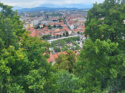Im Inneren des Torbogens werde ich von einem eisernen Wesen begrüßt, das irgendwo zwischen Schlange und Drache anzusiedeln ist. Dann öffnet sich vor mir ein weiter, großzügiger Innenhof in unterschiedlichen Ebenen, mit einer Café-Terrasse und einem großen freien Platz. Dies alles wird noch innerhalb der Burgmauern von gepflasterten und gekiesten Wegen eingerahmt. Am jenseitigen Ende erhebt sich der quadratische Turm mit den beiden Flaggen und einer von mächtigen Zinnen umschlossenen Aussichtsplattform, auf der immer mal wieder die Köpfe der Besucher auftauchen. Dort hinauf möchte ich, um mir den prächtigen Rundumblick über die ganze Stadt nicht entgehen zu lassen. Durch ein enges Gemäuer führen zunächst drei breitere Holztreppen auf ein Zwischengeschoss, wo von Zeit zu Zeit Multimedia-Darbietungen stattfinden. Danach steht mir heute nicht der Sinn. Ich drängele mich an den Wartenden vorbei zu einem schmalen Mauerdurchlass, an den direkt eine eiserne Wendeltreppe anschließt. Wie in einem vertikalen Bohrer zieht es mich nach oben. Der Weg scheint aber kein Ende zu nehmen. So hoch kam mir der Turm von außen gar nicht vor. Endlich erreiche ich das Loch zur Plattform. Hier ist es krachend voll. Mit Mühe erwische ich einen Platz an der dicken steinernen Balustrade und kann den Blick schweifen lassen. Tief unter mir liegt die Altstadt mit ihren Boulevards, Plätzen und dem geschäftigen Treiben in den Fußgängerzonen. Es ist, als würde ich auf einen Ameisenhaufen blicken. Auf der Ljubljanica, dem Fluss, der in weitem Bogen mitten durch die Innenstadt fließt, fahren Touristenboote. Die Fernsicht jedoch ist noch beeindruckender. Die Berge, die hier in der Nähe nicht ganz so hoch sind, bilden größtenteils einen Ring um die Stadt. Weiter weg sind schon imposantere Gebirgsketten zu erkennen. Alles ist grün, nicht nur in der Umgebung, auch das Stadtgebiet ist von sattgrünen Adern durchzogen. Die roten Dächer, die farbenfrohen Fassaden, der Fluss, die Natur, alles bildet ein harmonisches Potpourri einer mediterranen Metropole. Jetzt bekommt die Namensdeutung der geliebten Stadt ein Gesicht, das zu ihr passt. Die Kraft der Liebe scheint bis auf diesen Turm zu gelangen. Mehrmals mache ich meine Runde auf der Plattform, verweile, schaue, gehe weiter, schaue wieder. Es ist ein Anblick, an dem ich mich nicht satt sehen kann. Doch es zieht mich wieder hinab. So schön der Rundumblick von hier oben ist, ich möchte eintauchen in das Geschehen dort unten, Teil der Magie sein, die zwischen den Häusern, Brücken und Menschen fließt.